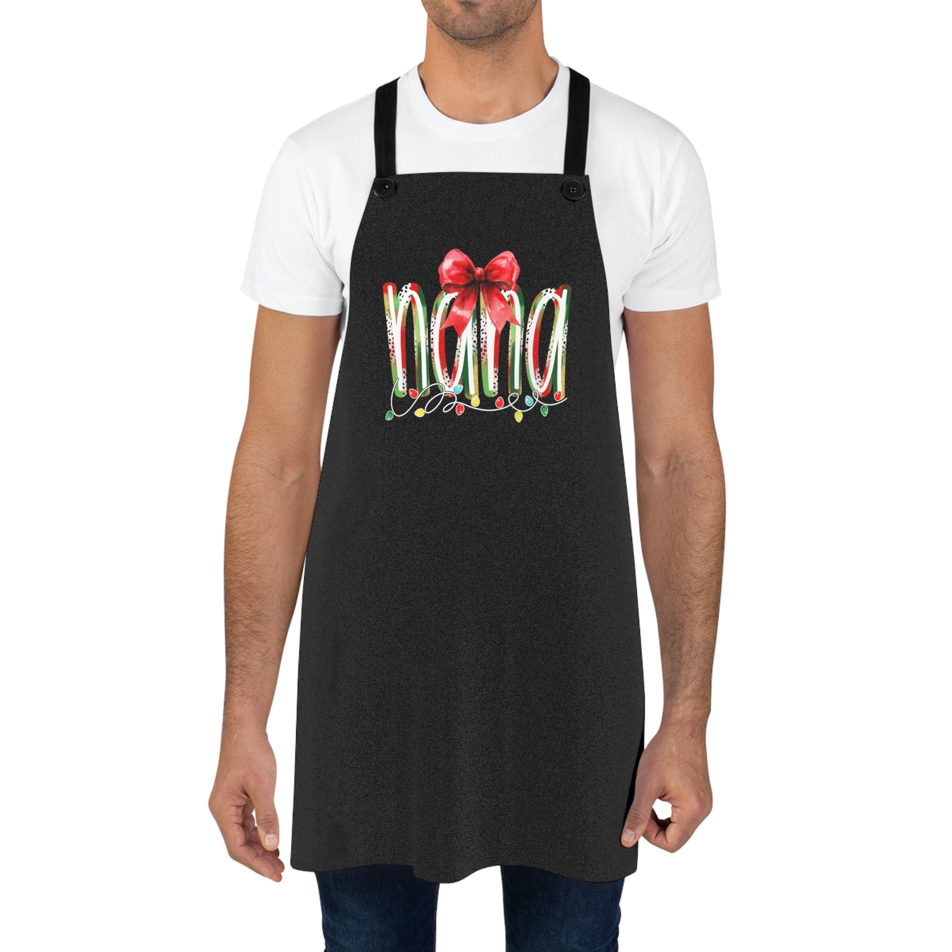 This black polyester apron brings cozy holiday cheer to the kitchen with a hand-lettered “nana” design wrapped in colorful string lights and topped with a luminous red bow. Lightweight yet durable, it slips on easily and the detachable black twill straps let you adjust or remove them for laundering. Overlocked seams and reinforced buttonholes stand up to regular use while the one-sided print keeps the festive artwork central and vivid. Wear it while baking cookies, wrapping gifts, or hosting a family dinner — it adds warmth, personality, and a dash of nostalgia to moments spent with grandchildren and loved ones.