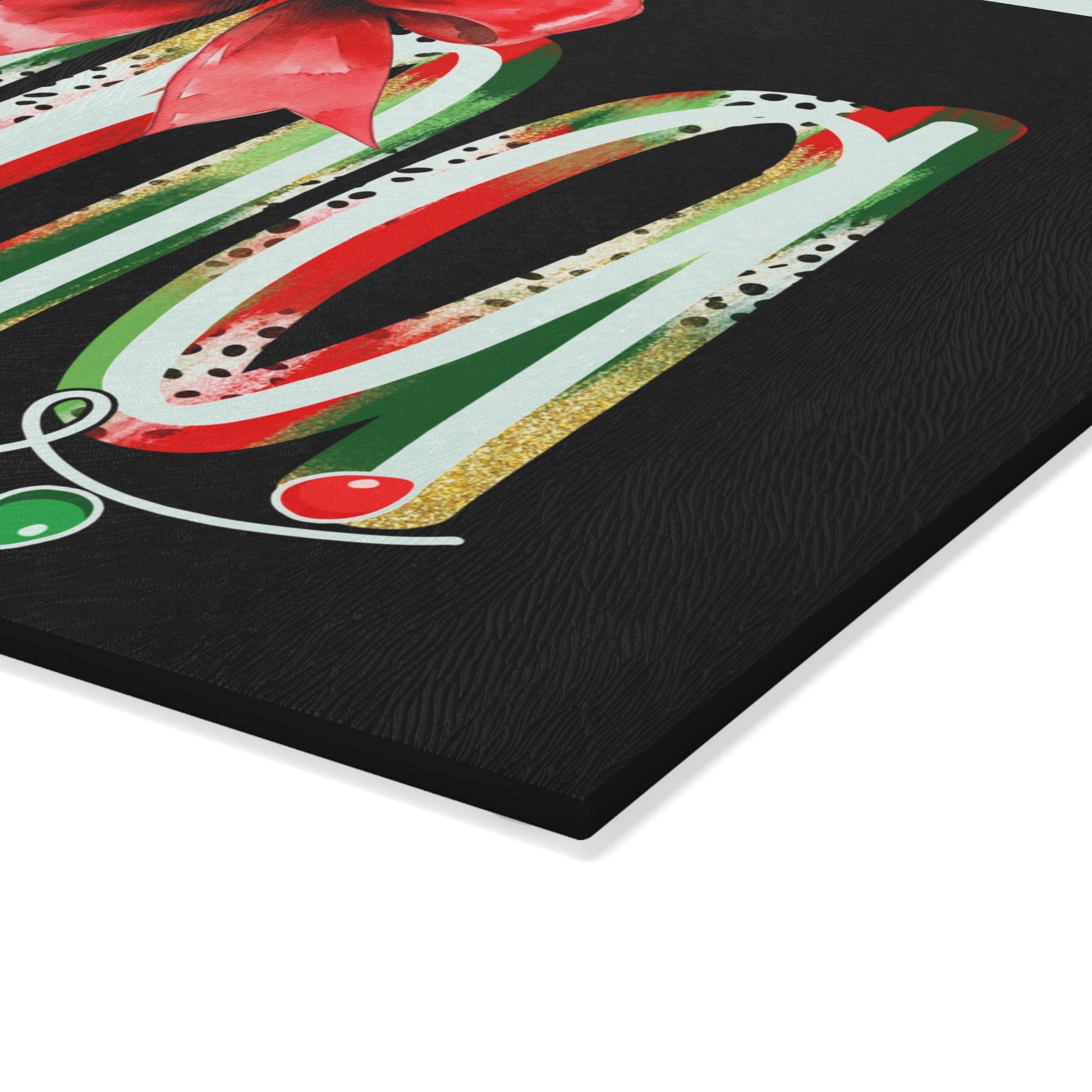 This tempered glass cutting board brings festive cheer to everyday kitchen prep. A bold, hand-painted style script sits against a deep background, accented with a watercolor red bow and a string of colorful holiday lights that glow with crisp, vibrant printing. The textured glass surface feels sturdy under knife work and stays more sanitary than wood or plastic. Four small rubber feet keep the board steady on counters while you slice, dice, or use it as a decorative serving surface for cookies and treats. Available in two sizes, it’s a bright, durable piece that blends seasonal charm with practical performance—easy to display and made to hold up to kitchen use when cared for by hand washing.