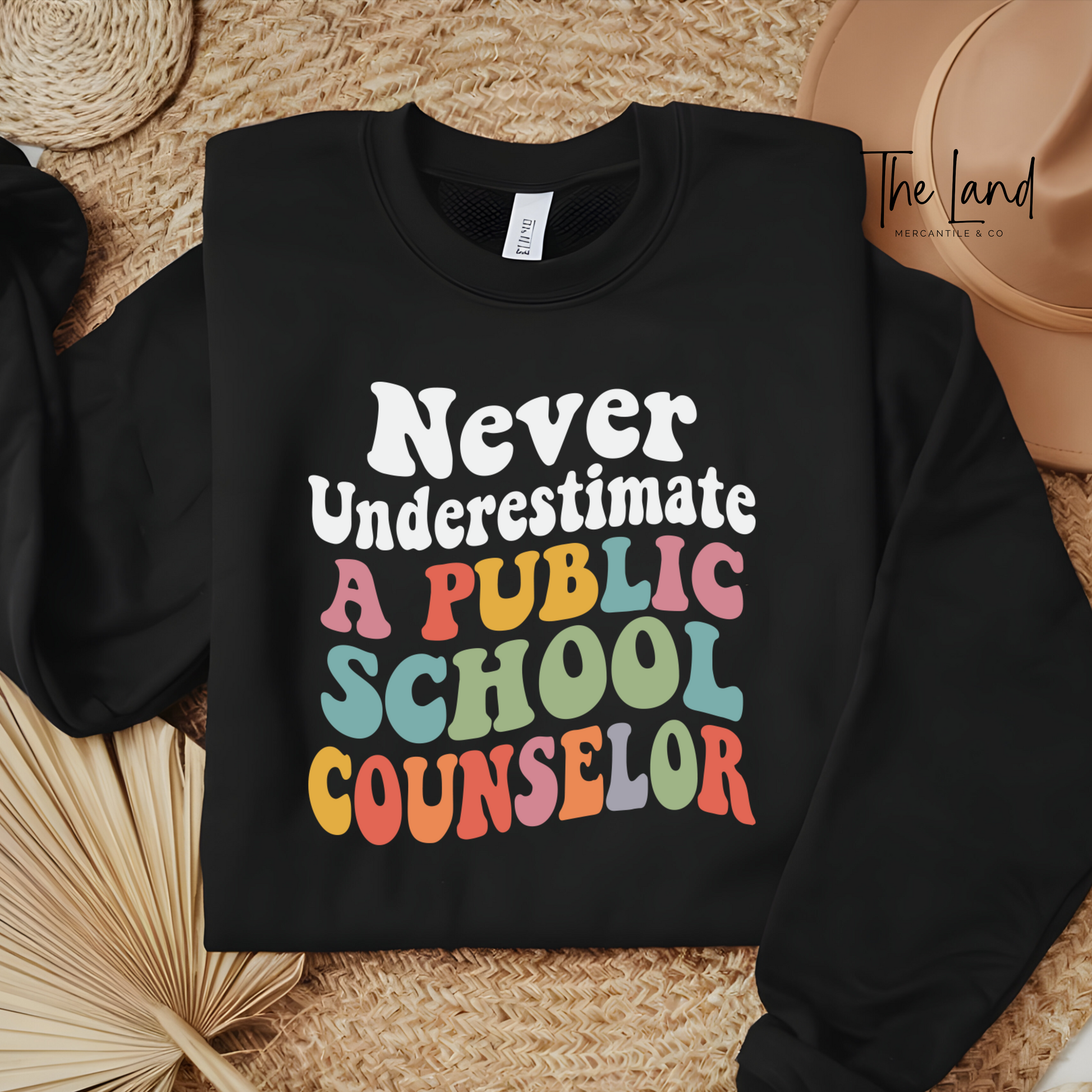 Celebrate school spirit with the Public School Counselor Sweatshirt. This cozy crewneck features retro colorful lettering that says “Never Underestimate a Public School Counselor.” Perfect for educators, staff, and counselor appreciation gifts. It gives a cozy and supportive vibe, fitting perfectly into the wardrobe of school professionals and those who appreciate the work of school counselors. Relevant for Teacher Appreciation Week, National School Counselor Week, and Back-to-School season.