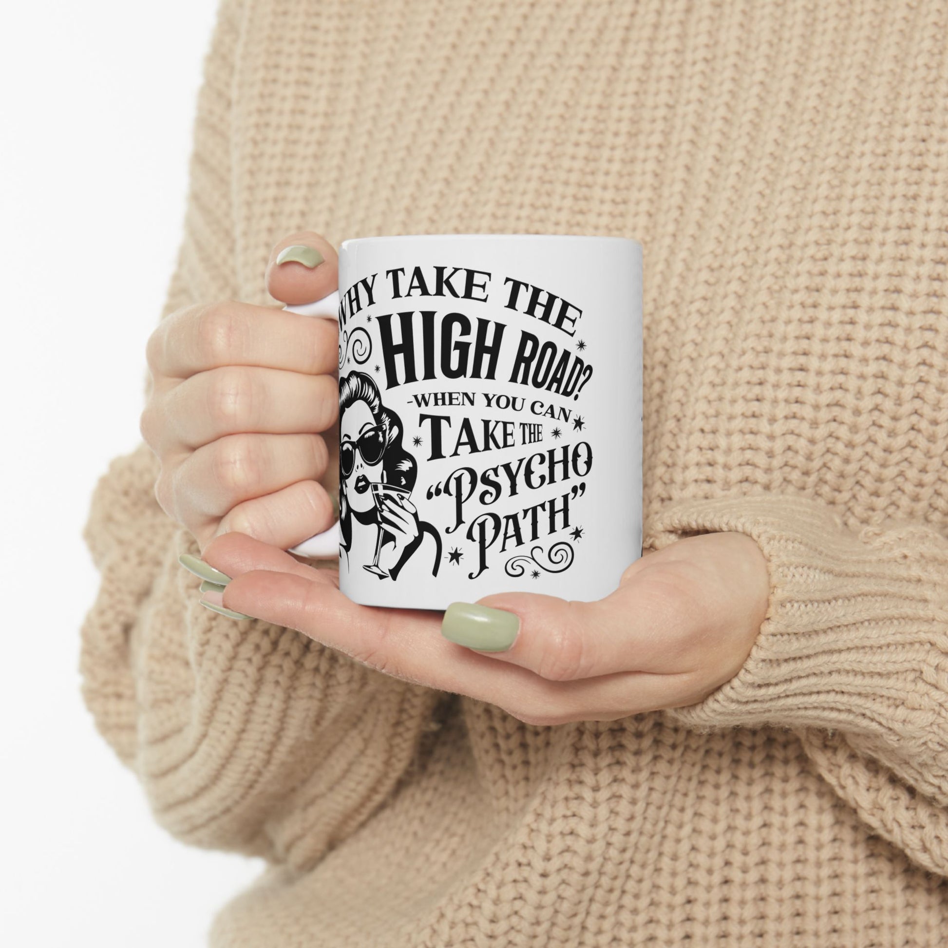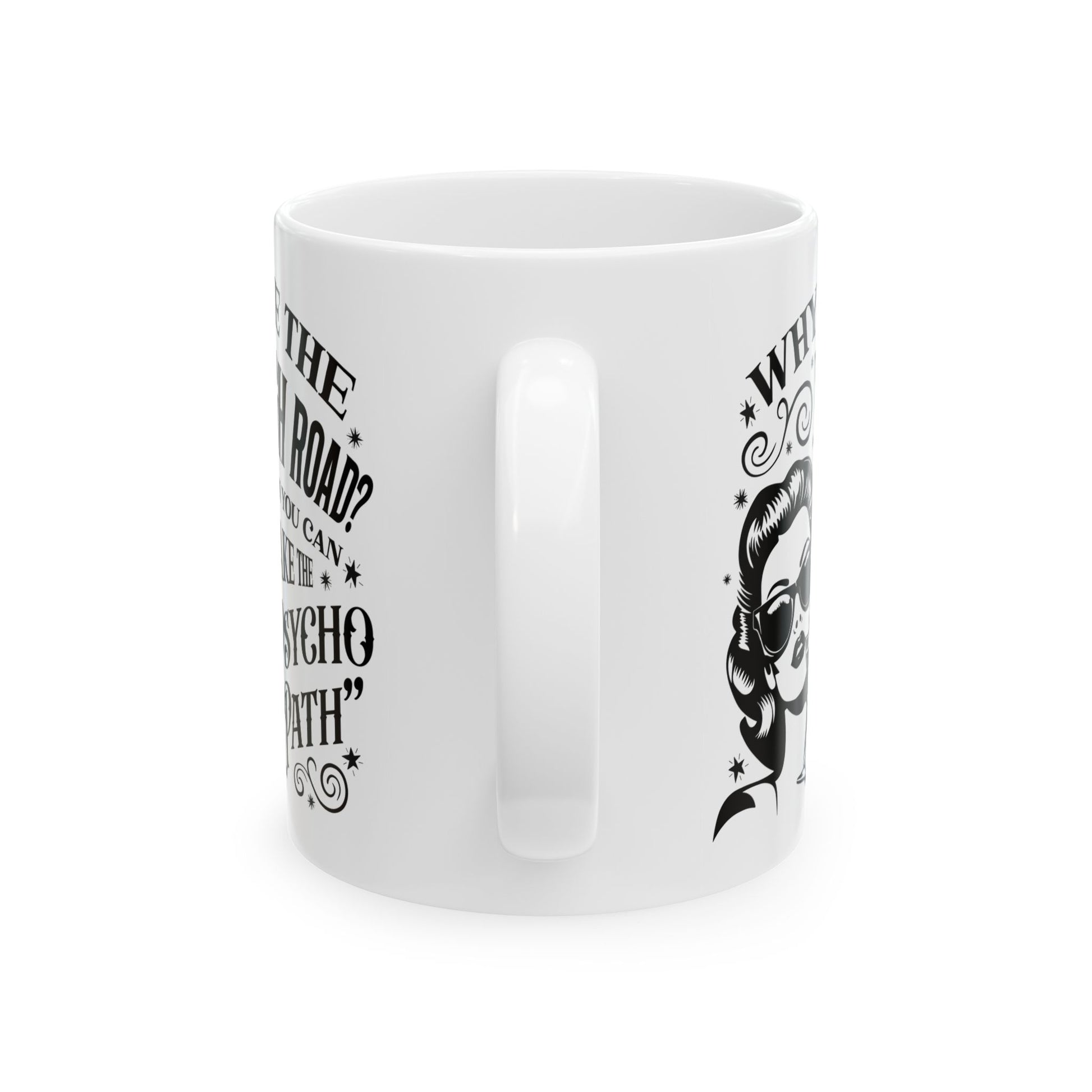 Why Take the High Road? Retro Woman Ceramic Coffee Mug - Funny Psycho Path Quote (11oz/15oz)